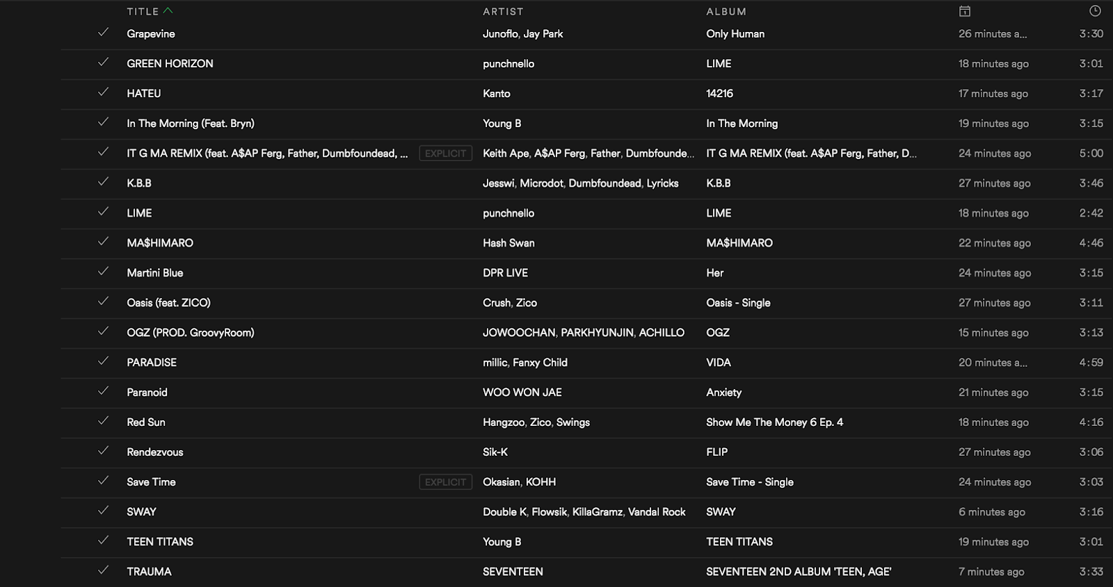 The artists on this side are artists that I am more familiar about and have listened to therefore it was easier for me to look for songs and artists. I relied less on the recent artist option and probably only used it two or three times. I've also noticed that most of the tracks have lots of featuring in it and I think this may have reflected the 'underground' rappers culture of the rappers knowing each other therefore being featured in each others songs. I've also added tracks for Kpop idols who rap because I think that Kpop idol rappers such as (Ravi, Agust D and Seventeen) are slowly being stereotyped less now due to rap shows that get them recognised as 'rappers' by other rappers in Korea.